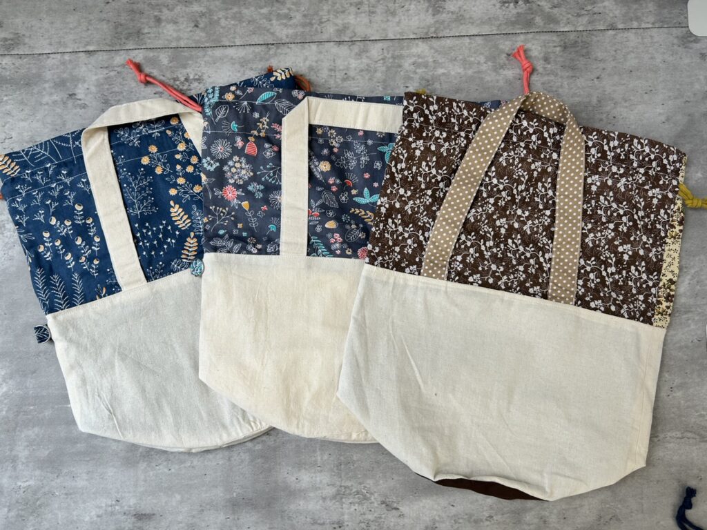 ■花柄生地を使った3種類の巾着型トートバッグ