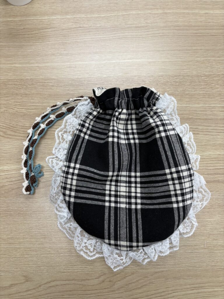 最後の工程は、ステッチを入れて紐を通し、ミニ巾着を完成させる作業です。