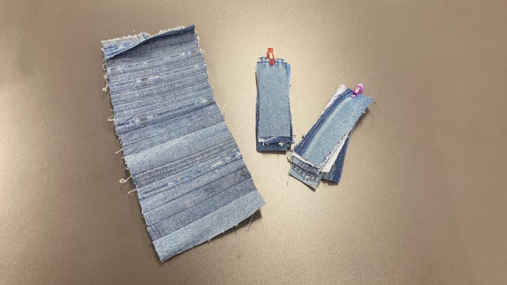 デニムパンツの残布を余すことなく使うためのパッチワーク制作の様子です。