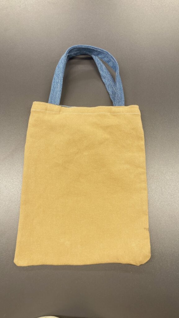 持ち手の縫製や全体の仕上げ工程を経て、デニムをリメイクしたかわいいトートバッグが完成しました。