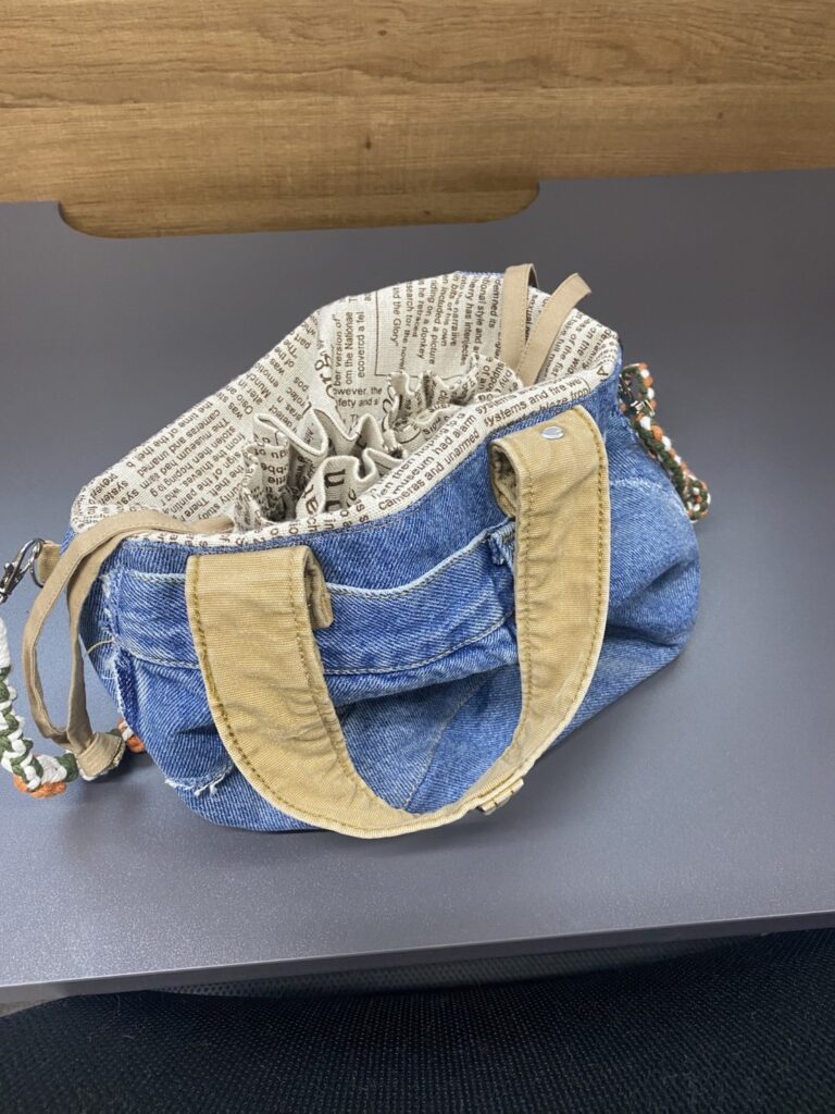 異なるデニム生地を組み合わせた、丸底タイプのトートバッグが完成しました。
