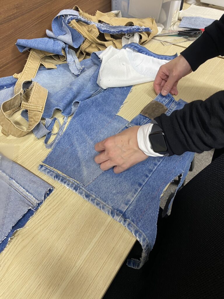 利用者さんは、どの部分を活かすかを考え、ポケットやステッチの表情が映える位置を選んでいます。