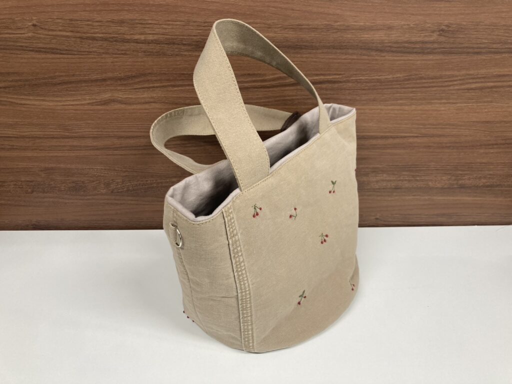 今回ご紹介するのは、小さなサクランボの刺繍が散りばめられた生地を使用したトートバッグです。