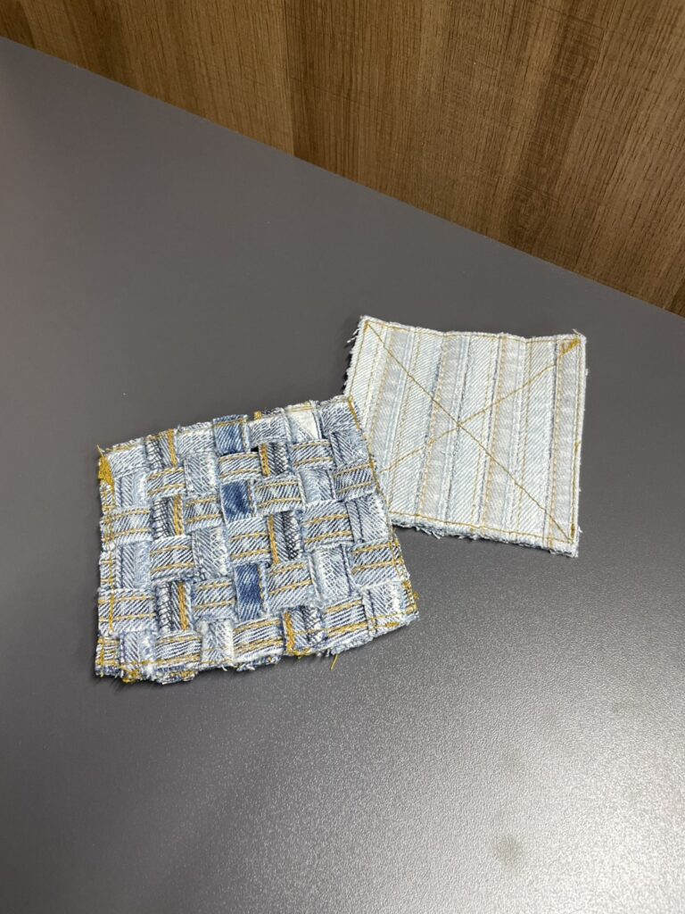 デニム生地を細かく組み合わせ、織り込んだようなデザインに仕上げた作品もあります。