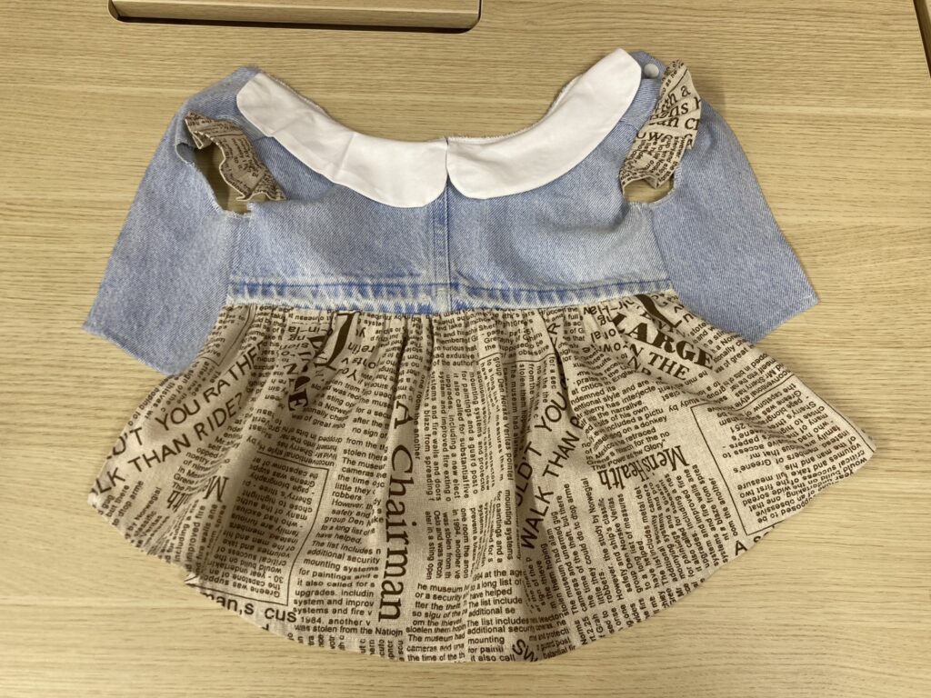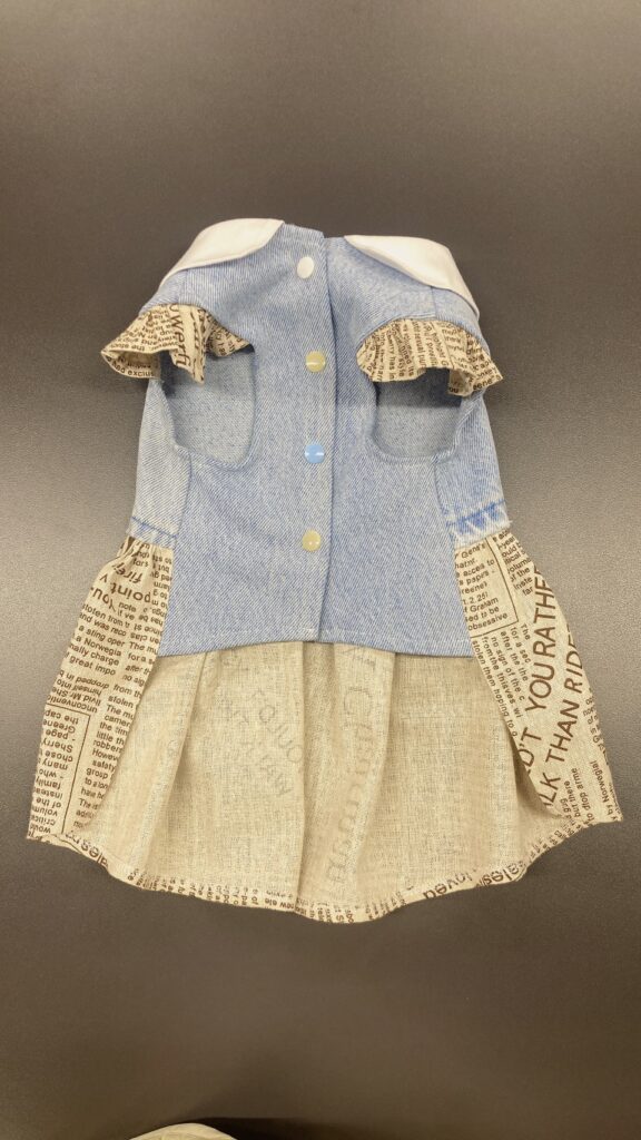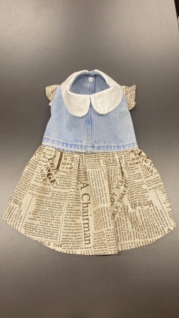 今回制作したのは、淡い色味のデニム生地と英字柄のコットン生地を組み合わせたワンピースタイプのペット服です。