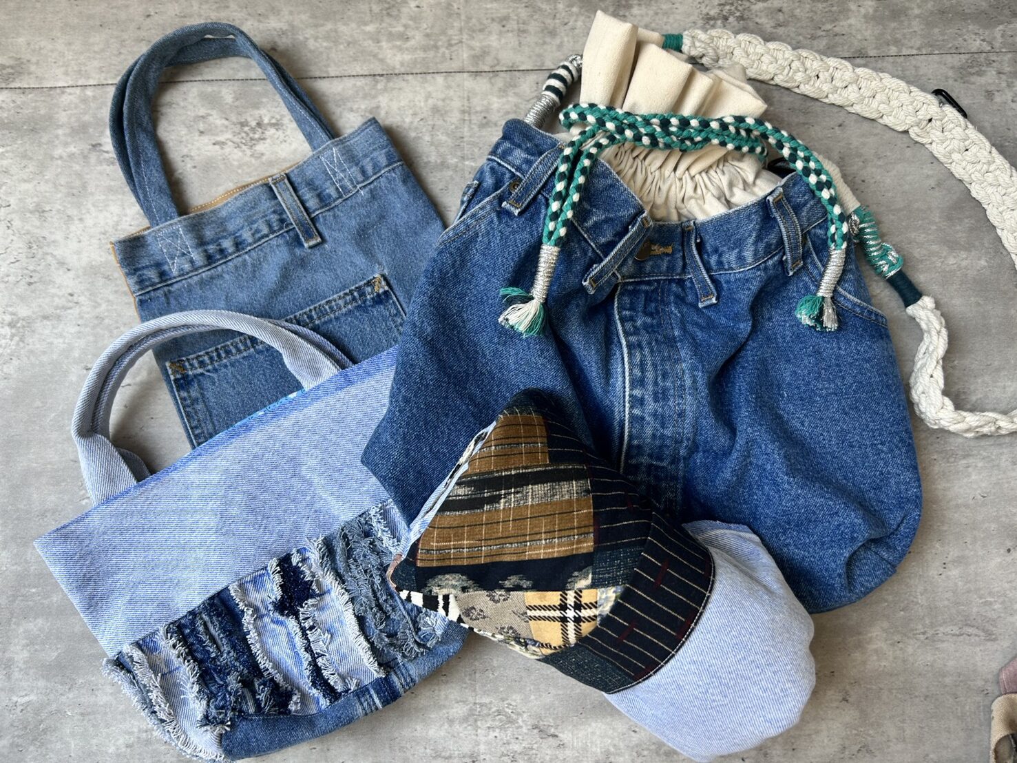 さまざまな色味や風合いのデニムが組み合わさり、同じ素材から生まれたとは思えないほど個性豊かな作品が並んでいます。