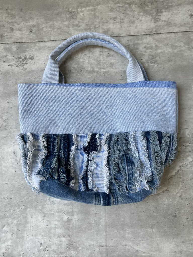フリンジ加工が施されたデニムリメイクトートバッグ